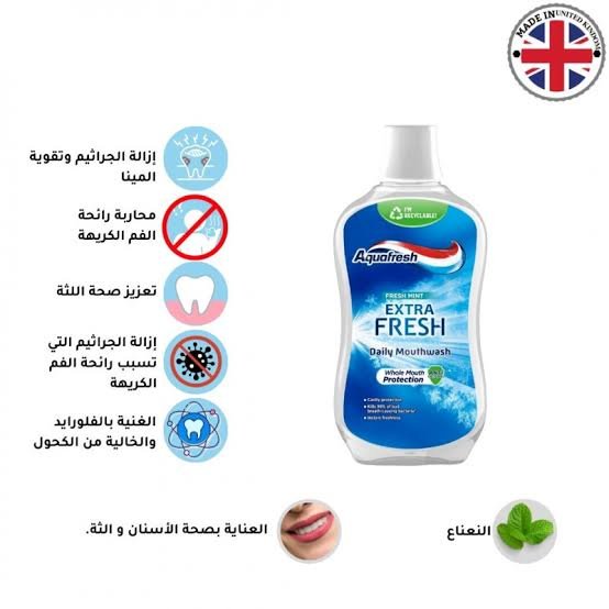 + Free Shippingغسول فم أكوا فريش إكسترا فريش 500 مل – تنظيف عميق وانتعاش طويل الأمد، مكافحة البكتيريا والرائحة الكريهة