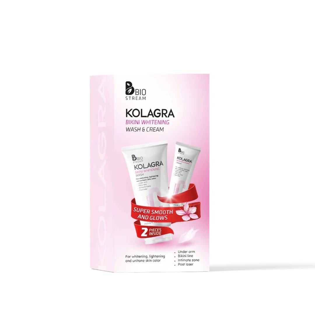 كولاجرا بيكيني غسول تفتيح +كريم تفتيح هي مجموعة متخصصة من Kolagra لتفتيح المناطق الحساسة مثل خط البيكيني، الإبط، والمناطق الحميمة. الغسول ينظف بلطف، يتحكم في الرائحة والتعرق الشديد، ويوازن الـpH دون تهيج. الكريم يرطب ويفتح بفضل هيكسيل ريسورسينول، مستخلص إمليكا، ألانتوين، نياسيناميد، حمض اللاكتيك، وفيتامين B5 لتقليل التصبغات.
