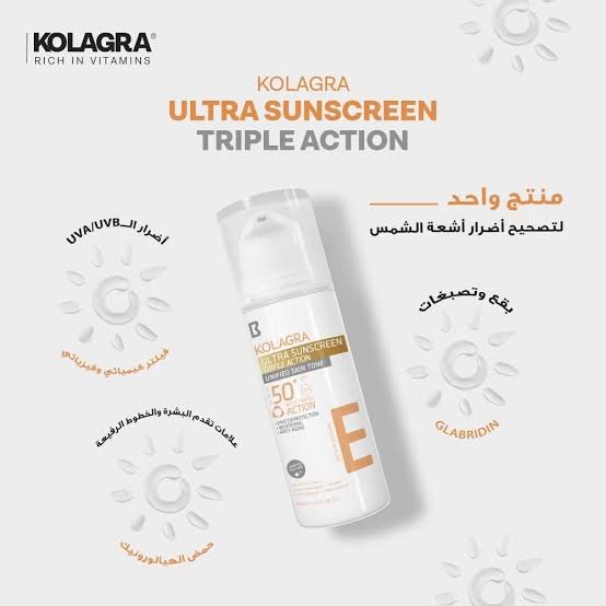 كولاجرا صن سكرين تربيل اكشن حماية 50 هو واقي شمس ثلاثي المفعول من Kolagra Ultra Sunscreen، يجمع فلاتر كيميائية (تينوسورب S، أوكتوكريلين) وفيزيائية (تيتانيوم ديوكسايد، زنك أكسايد) لـSPF50+ وحماية واسعة من UVA/UVB/IR.